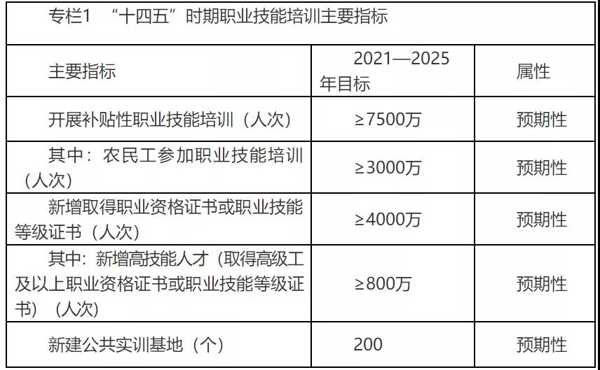 开展大规模职业技能培训,是提升劳动者就业创业能力、缓解结构性就业矛盾、促进扩大就业的重要举措,是推动高质量发展的重要支撑。本规划依据《中华人民共和国国民经济和社会发展第十四个五年规划和2035年远景目标纲要》编制,提出了“十四五”时期加强职业技能培训工作的指导思想、基本原则、主要目标、重点任务和保障措施,是推动职业技能培训高质量发展的工作指引。“十三五”时期,坚持以人民为中心的发展思想,职业技能培训大规模开展。2019年,国务院决定从失业保险基金结余中拿出1000亿元组织实施职业技能提升行动,面向企业职工、就业重点群体和贫困劳动力组织实施职业技能培训。五年来,全国共组织开展补贴性职业技能培训近1亿人次;其中,培训企业职工超过3000万人次,农民工超过4000万人次,贫困劳动力超过900万人次。全国技能人才总量超过2亿人,高技能人才超过5000万人,均比“十二五”期末有较大幅度增长。技能人才总量扩大,结构逐步优化,就业质量不断提升。“十四五”时期,我国开启全面建设社会主义现代化国家、向第二个百年奋斗目标进军新征程。党中央、国务院部署建设技能型社会,实施就业优先战略和技能提升行动,健全终身职业技能培训制度,为职业技能培训发展提供了根本保证。我国已进入高质量发展阶段,实施新时代人才强国战略,推进制造强国、质量强国建设,发展实体经济,亟需加强创新型、应用型、技能型人才培养,壮大高技能人才队伍,为职业技能培训发展创造广阔空间。新一轮科技革命和产业变革突飞猛进,就业新增长点、新就业形态不断发展,劳动者参加培训提升人力资本和专业技能的内在动力逐渐增强。但也要看到,“十四五”时期职业技能培训面临新的挑战。产业转型升级、技术进步对劳动者技能素质提出了更高要求,人才培养培训不适应市场需求的现象进一步加剧。“就业难”与“招工难”并存,高校毕业生等重点群体和农村转移劳动力就业创业能力与用人需求存在差距。职业技能培训难以适应数字技术、人工智能发展要求,培训基础能力薄弱,针对性有效性需要进一步提高,支持服务体系亟需完善,尊重技能尊重劳动的社会氛围有待进一步优化。职业技能培训的规模质量与建设技能型社会需求仍有差距,必须深刻认识职业技能培训工作的短板和不足,全面分析面临的困难和挑战,坚持问题导向,加大工作力度,发动全社会力量,共同推动职业技能培训高质量发展,建设规模宏大、质量过硬、结构合理的技能劳动者队伍。高举中国特色社会主义伟大旗帜,以习近平新时代中国特色社会主义思想为指导,深入贯彻党的十九大和十九届二中、三中、四中、五中、六中全会精神,认真落实党中央、国务院决策部署,立足新发展阶段,完整、准确、全面贯彻新发展理念,构建新发展格局,推动高质量发展,以深化供给侧结构性改革为主线,以改革创新为动力,推进技能型社会建设,全面实施技能中国行动,进一步健全完善劳动者终身职业技能培训制度,充分发挥市场在资源配置中的决定性作用,配合实施国家重大战略、区域协调发展战略,加大职业技能培训力度,吸引更多劳动者技能就业技能成才,为全面建设社会主义现代化国家提供有力的人才和技能支撑。——坚持立德树人、德技并修。大力弘扬和培育劳模精神、劳动精神、工匠精神,坚持工学结合、知行合一、德技并修,聚焦劳动者技能素质提升,注重培养劳动者的职业道德和技能素养。——坚持就业导向、提质扩容。牢固树立职业技能培训为就业服务的理念,不断提升培训质量,扩大培训规模,为劳动者储备就业技能,促进就业创业,提高工作能力。——坚持共建共享、协同发力。加强对职业技能培训资源的统筹利用,发挥公共实训基地和职业院校(含技工院校,下同)等功能作用,鼓励支持龙头企业、社会资源依法参与职业技能培训,推动共建共享,形成工作合力。——坚持市场引导、政府支持。构建以企业为主体、职业院校为基础、政府推动与社会支持相结合的职业技能培训体系,引导劳动者根据社会需要和个人需求积极参与职业技能培训。——终身职业技能培训制度更加完善。深入实施职业技能提升行动,形成贯穿劳动者学习工作终身,覆盖劳动者职业生涯全程,适应就业创业和人才成长需要以及经济社会发展需求的终身职业技能培训制度,推进终身职业技能培训组织实施。——共建共享职业技能培训体系更加健全。健全职业技能培训共建共享机制,持续推动公共职业技能培训扩容提质,优化公共职业技能培训资源供给。加大政府、企业、社会等各类培训资源优化整合力度,提高培训供给能力,提升职业技能培训的精准性和实效性。——创新型、应用型、技能型人才队伍不断发展壮大。稳步扩大培训规模,持续提升培训质量,技能劳动者队伍结构不断优化,就业创业能力明显提高,高技能人才不断涌现。破除学历、身份等限制,技能人才成长通道更加顺畅,多元化评价方式不断完善,技能等级与薪酬分配的联系更加密切,职业技能竞赛引领和推动技能成才的作用更加显著。——职业技能培训服务更加有效。培训与就业的衔接更加紧密,形成个人投入、企业支持、政府补贴共同投入的机制,鼓励社会资本投入,形成职业技能培训多元供给体系,市场引导和政府补贴